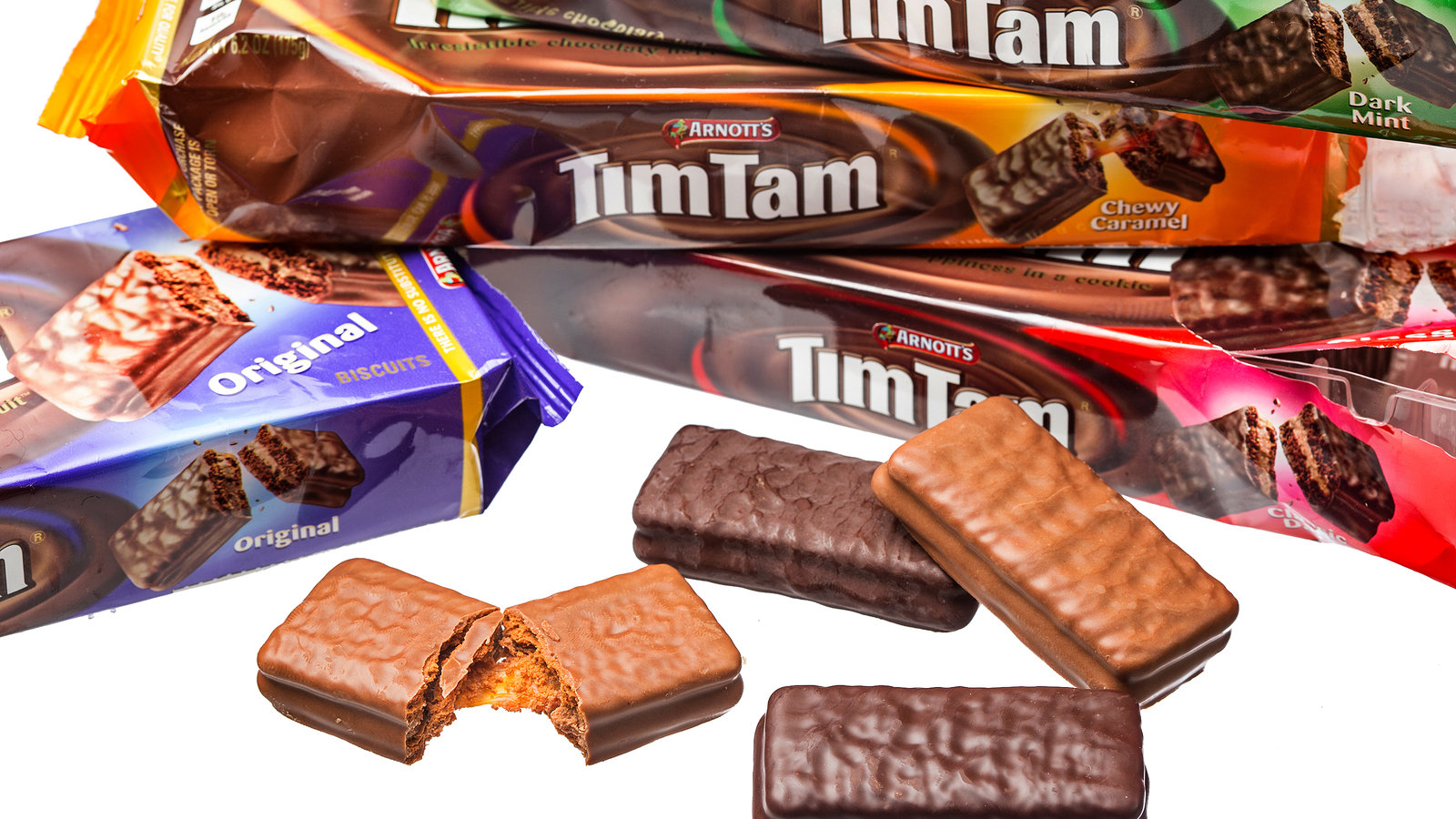 Tim Tam is a brand of chocolate biscuit introduced by the Australian biscuit company Arnott’s Biscuits Holdings in 1964. It consists of two malted biscuits separated by a light hard chocolate cream filling and coated in a thin layer of textured chocolate.