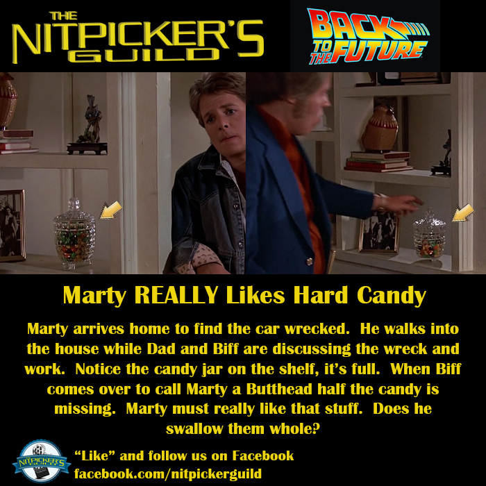 Another rare nit from BttF that cannot use Time Travel for the explanation as none of the time travel has occurred by this point in the film. Either Marty has a severe addiction to the sweets or he knows Biff is going to help himself to the candy and Marty is trying to empty the container before Biff gets over to the jar.