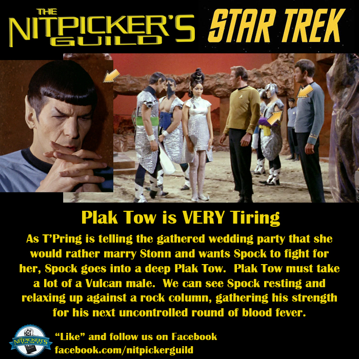 Spock is leaning quietly up against that stone pillar. He must be very tired.