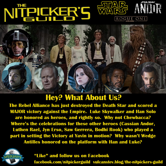 I suppose a case can be made for the fact that most of the heroes listed were dead and the Rebellion didn’t have the necessary images on Yavin IV to honor the deceased contributors. That said, Wedge should have been on stage with Han and Luke. Chewbacca should have received his medal that day instead having to wait.