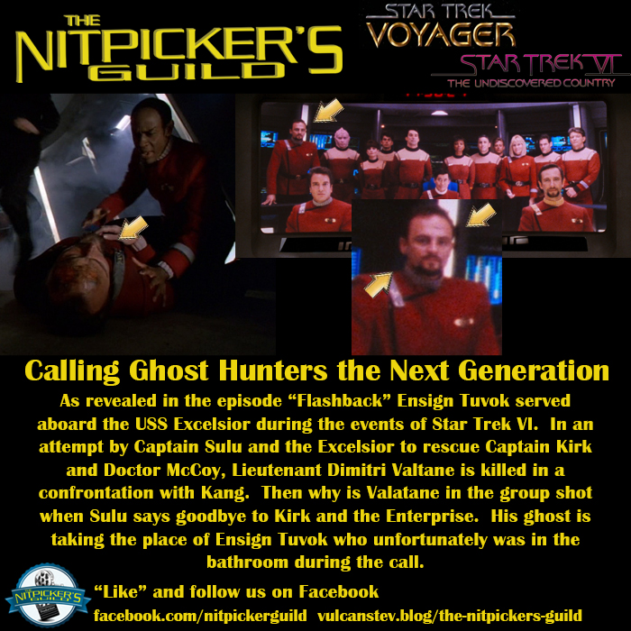 It is my solemn duty as a Nitpicker to explain why this discrepancy is NOT a mistake. As I state in the meme, Tuvok was in the bathroom at the moment of the goodbye. Lt Valtane’s ghost managed to become corporeal just long enough to be part of the group shot standing in what would have been Ensign Tuvok’s place.