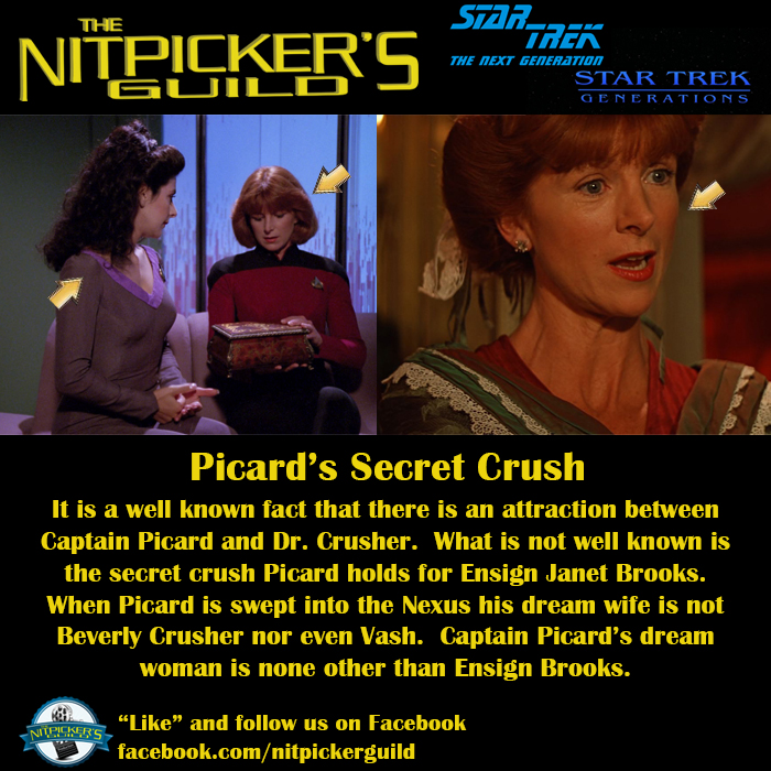 Kirk finds himself reliving his days with Antonia. Picard finds himself in Chateau Picard with his wife and children. So WHY is the woman that brings him so much joy and contentment Ensign Brooks and not Doctor Crusher, not Vash, not Lt. Commander Nella Daren (“Lessons” S6 Ep19), nor even Eline (his wife from “The Inner Light”).