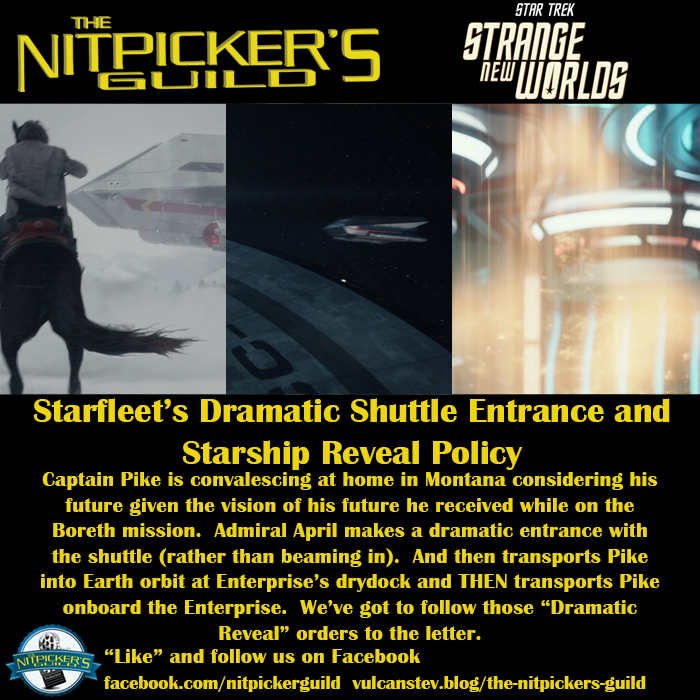 But once Pike has agreed to return to Starfleet and his captaincy of the Enterprise, why not just beam him directly from Montana? Because of a tradition that started with Archer’s flyby of the NX-01 which has since been codified in Starfleet Regulation 5473.6