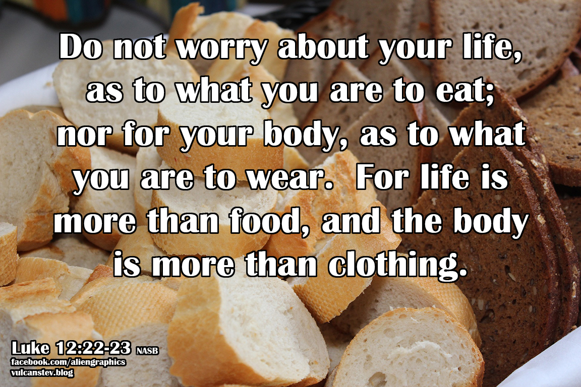 22 And He said to His disciples, “For this reason I tell you, do not worry about your life, as to what you are to eat; nor for your body, as to what you are to wear. 23 For life is more than food, and the body is more than clothing. 24 Consider the ravens, that they neither sow nor reap; they have no storeroom nor barn, and yet God feeds them; how much more valuable you are than the birds! 25 And which of you by worrying can add a day to his life’s span? 26 Therefore if you cannot do even a very little thing, why do you worry about the other things? 27 Consider the lilies, how they grow: they neither labor nor spin; but I tell you, not even Solomon in all his glory clothed himself like one of these. 28 Now if God so clothes the grass in the field, which is alive today and tomorrow is thrown into the furnace, how much more will He clothe you? You of little faith! 29 And do not seek what you are to eat and what you are to drink, and do not keep worrying. 30 For all these things are what the nations of the world eagerly seek; and your Father knows that you need these things. 31 But seek His kingdom, and these things will be provided to you. 32Do not be afraid, little flock, because your Father has chosen to give you the kingdom.