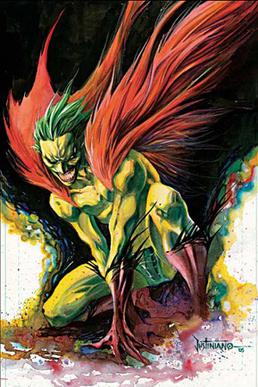 Originally, Ryder’s transformation into the Creeper involved activating a device that granted superhuman abilities while also causing his face to be covered in yellow make-up, his hair to be concealed by a green wig, and his clothing to be instantly replaced by a yellow and red costume with green trunks and a fur-like cape; as the Creeper, Ryder then shifted his voice tone and acted chaotically to intimidate foes and protect his identity. Starting in 1987, it was said Ryder suffered an actual slight change in personality when he became the Creeper, as the device not only empowered him and dressed him in a costume but also altered his brain chemistry. Starting in 1997, Ryder and the Creeper are treated as two personalities sharing the same body. The 2006–2007 miniseries The Creeper (vol. 2) presented a new origin. Starting with this story, Ryder’s transformation no longer involved a costume and is depicted as a physical transformation. Along with his strange appearance, the Creeper is characterized by superhuman strength, agility, healing and stamina, as well as a maniacal laugh. Starting in the 1990s, this laugh has been able to cause pain or immobility in enemies. Through experience and training, the Creeper is a formidable fighter and acrobat.