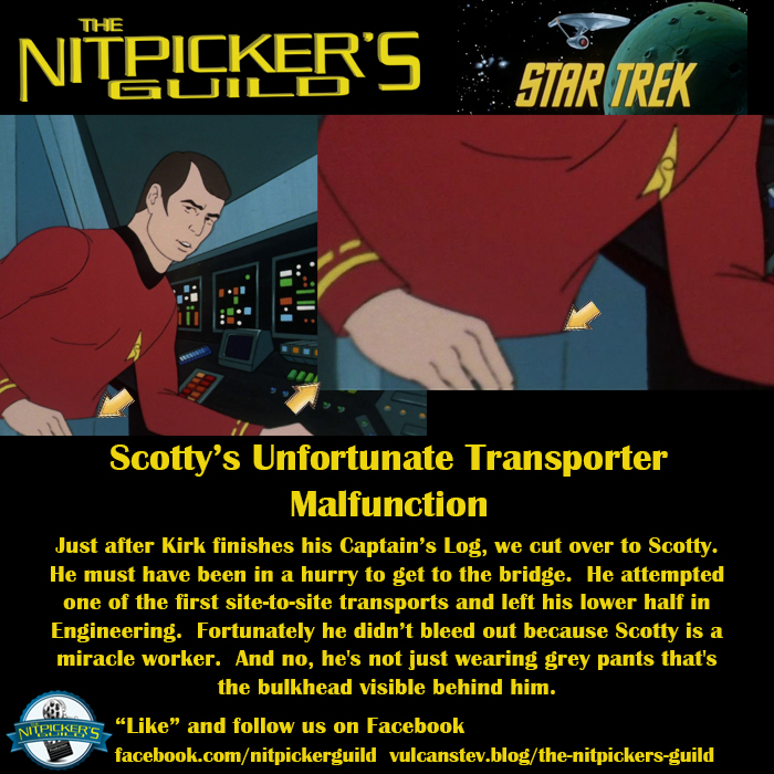This particular nit is seen throughout the entire series as it was subsequently used as stock footage for whenever a shot of Scotty was needed at the engineering station. Yeah, they saved money by only drawing Scotty’s torso but it didn’t quite line up with the background. To be fair, this detail went unnoticed on the curved tube TVs of the time.