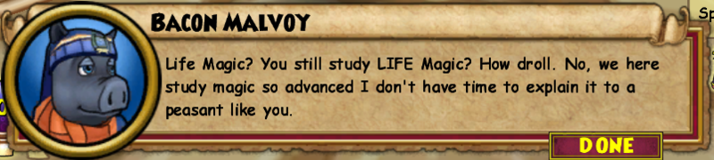 Life Magic? You still study LIFE magic? How droll. No we here study magic so advanced I don’t have time to explain to explain it to a peasant like you. – Bacon Malovy