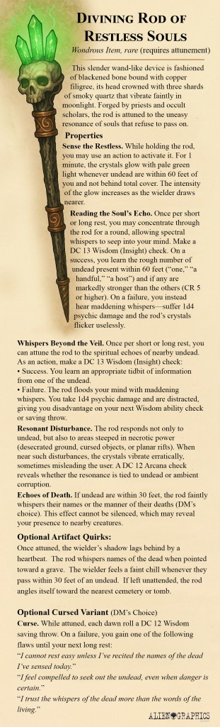 Once attuned, the wielder’s shadow lags behind by a heartbeat. The rod whispers names of the dead when pointed toward a grave. The wielder feels a faint chill whenever they pass within 30 feet of an undead. If left unattended, the rod angles itself toward the nearest cemetery or tomb.