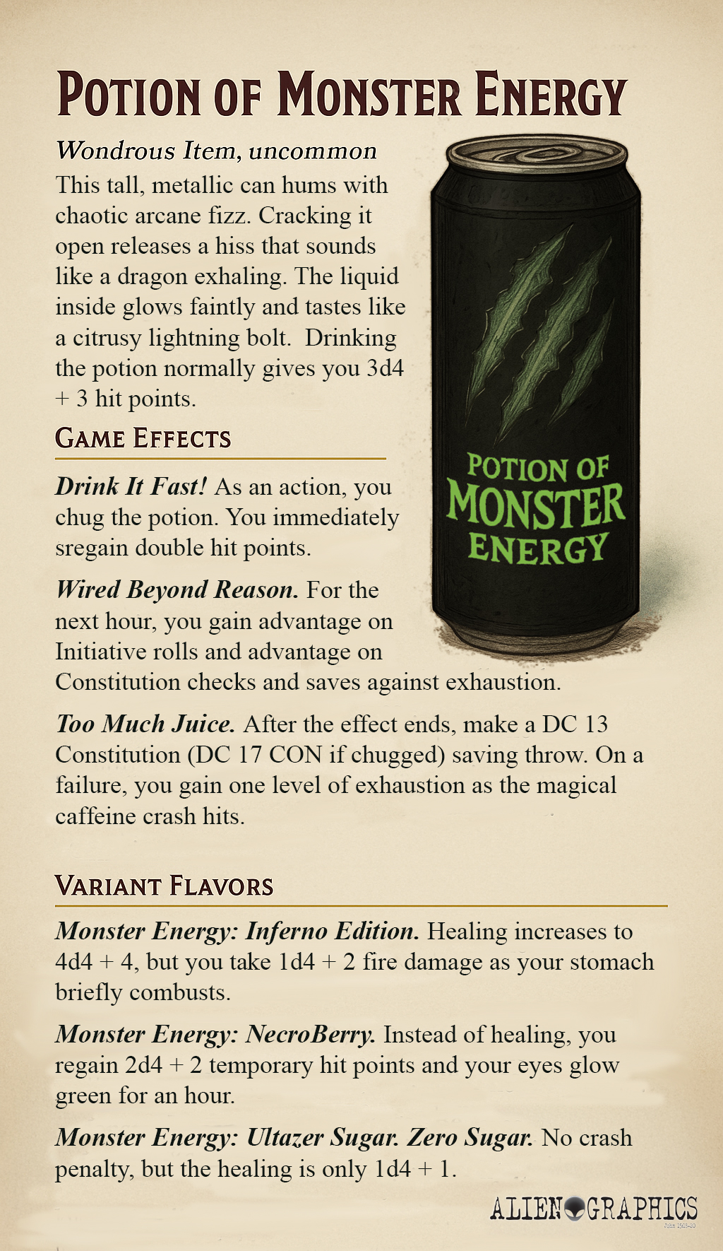 - Monster Energy: NecroBerry. Instead of healing, you regain 2d4 + 2 temporary hit points and your eyes glow green for an hour.