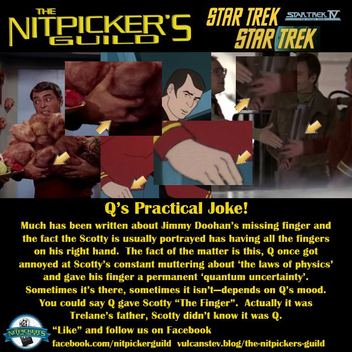 Trekkers know the reality is that James Doohan lost a finger in in WWII. However Scotty the character was portrayed as having all his fingers, except in rare instances like the two seen above.