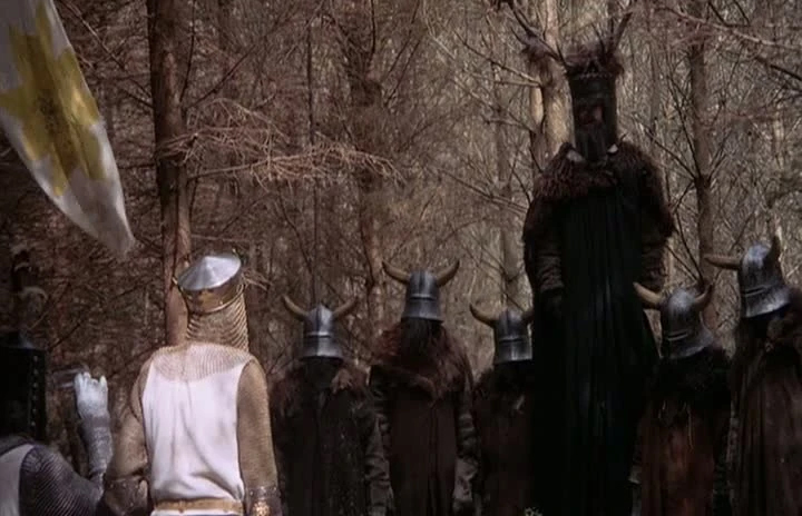 The knights appear silhouetted in a misty wood, wearing robes and horned helmets; their full number is never apparent, but there are at least six. The leader of the knights, played by Michael Palin, is the only one who speaks to the party. He is nearly double Arthur’s height, and wears a great helm decorated with long antlers. The other knights are large, but of human proportions, and wear visored sallet helmets decorated with cow horns. The knight explains that they are the “keepers of the sacred words ‘Ni’, ‘Peng’, and ‘Neee-Wom'”. Arthur confides to Sir Bedivere, “those who hear them seldom live to tell the tale!”