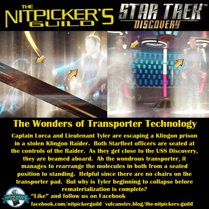 Two questions about this scene: Why is Tyler beginning to collapse before the transport is complete? And why, if Tyler is so badly injured, didn’t Lorca have him beamed direct to Sickbay?