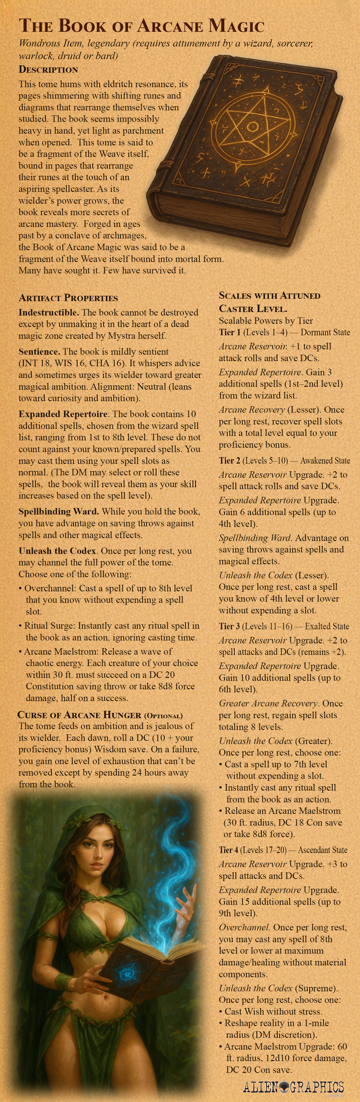 This tome hums with eldritch resonance, its pages shimmering with shifting runes and diagrams that rearrange themselves when studied. The book seems impossibly heavy in hand, yet light as parchment when opened. This tome is said to be a fragment of the Weave itself, bound in pages that rearrange their runes at the touch of an aspiring spellcaster. As its wielder’s power grows, the book reveals more secrets of arcane mastery. Forged in ages past by a conclave of archmages, the Book of Arcane Magic was said to be a fragment of the Weave itself bound into mortal form. Many have sought it. Few have survived it.