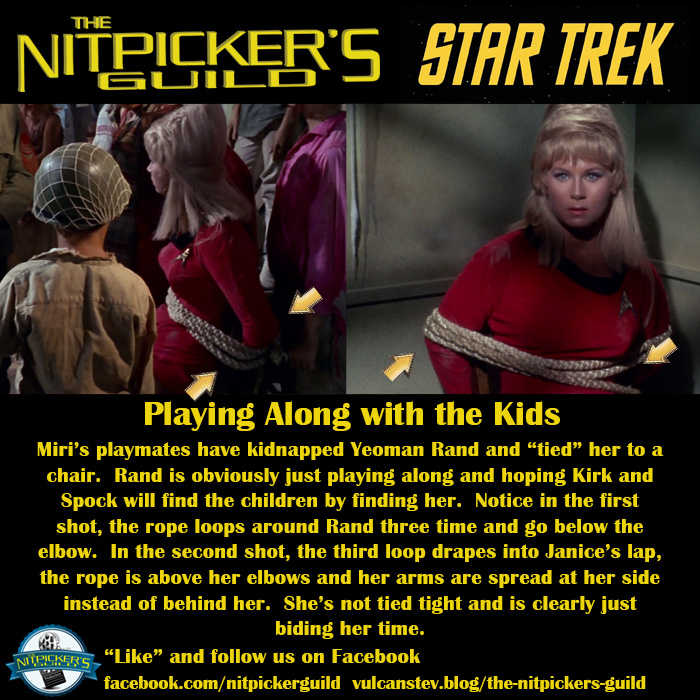 Yoeman Rand has been kidnapped and inexpertly tied to a chair. You can almost see her thinking, ‘If I just stay here, Captain Kirk will have found the kids’ hiding place. Oops the rope is falling off, I’d better readjust my arms and spread them out so the rope doesn’t come loose and fall of completely.’