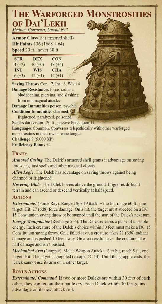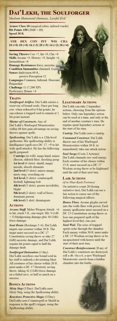⚔️ Campaign Role: Dai’Lekh is best used as a mid-campaign villain who becomes the final boss of a Warforged-themed arc. His constructs soften up the party, but he remains the true threat, capable of fighting toe-to-toe with even high-level adventurers when surrounded by his creations.