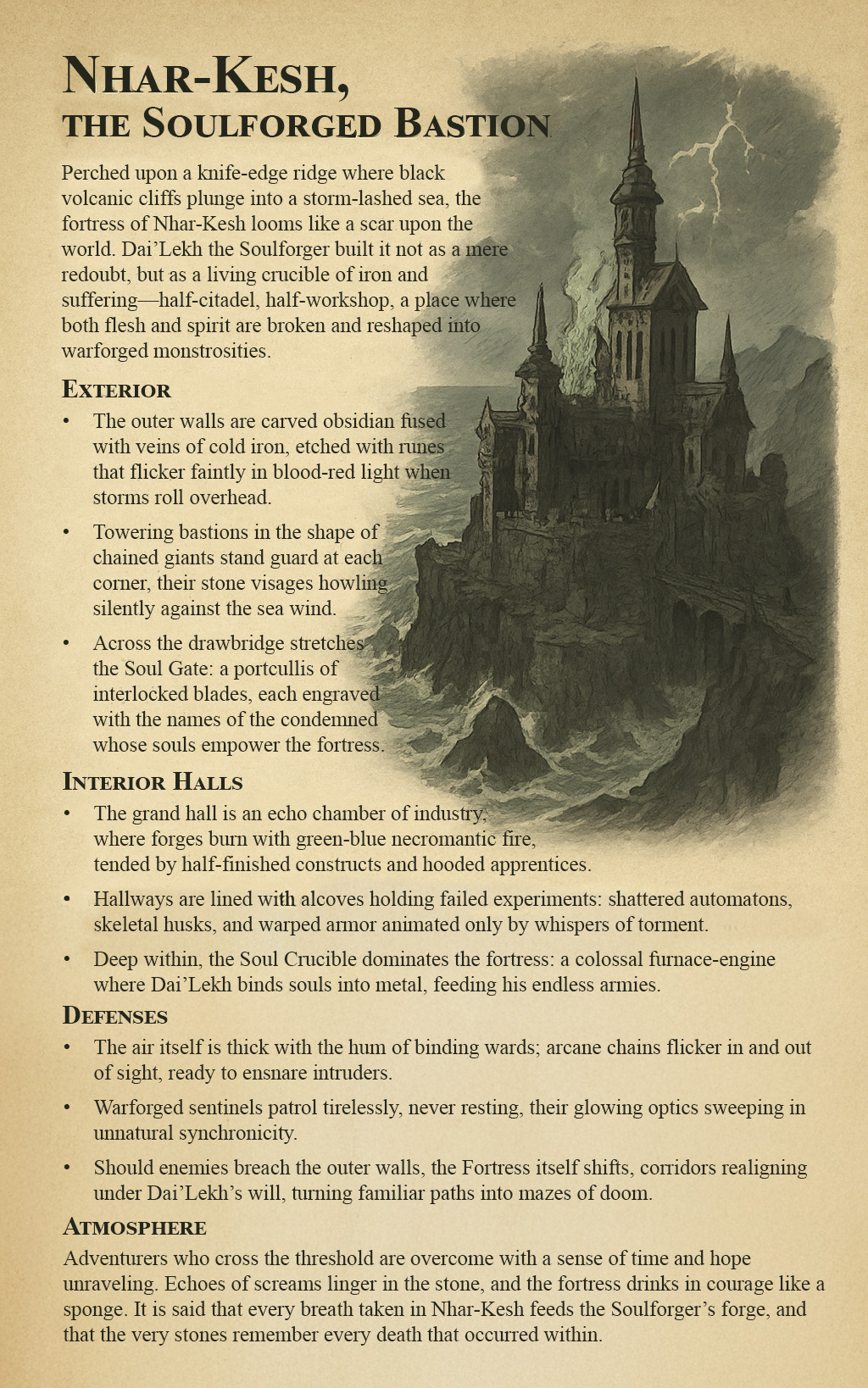 Perched upon a knife-edge ridge where black volcanic cliffs plunge into a storm-lashed sea, the fortress of Nhar-Kesh looms like a scar upon the world. Dai’Lekh the Soulforger built it not as a mere redoubt, but as a living crucible of iron and suffering—half-citadel, half-workshop, a place where both flesh and spirit are broken and reshaped into warforged monstrosities.