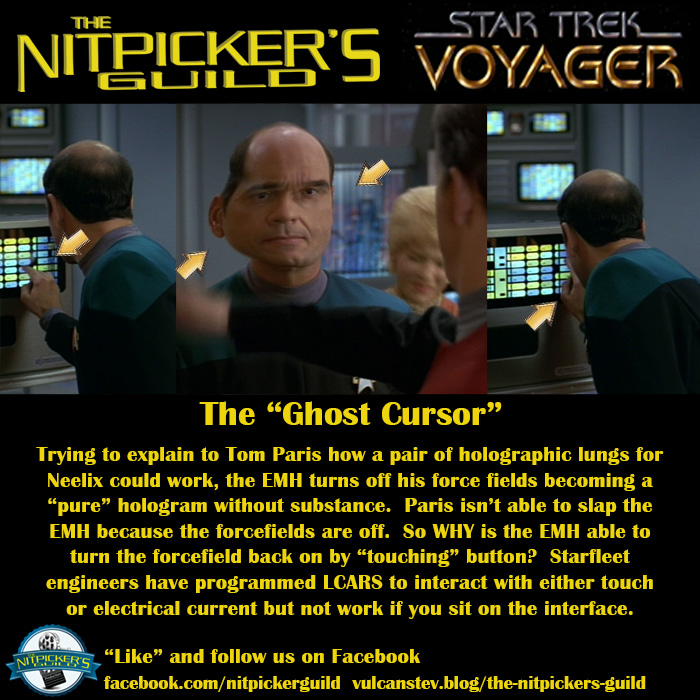 This one has always bothered me. I understand that the EMH only has a solid form due to the force field projectors in Sick Bay. I get that those fields can be turned off manually. What I didn’t get until the “Ghost Cursor” explanation came to me is HOW could a hologram turn the force fields back on manually. Especially when Riker can sit on the Tactical Station without firing of phasers or photon torpedoes.