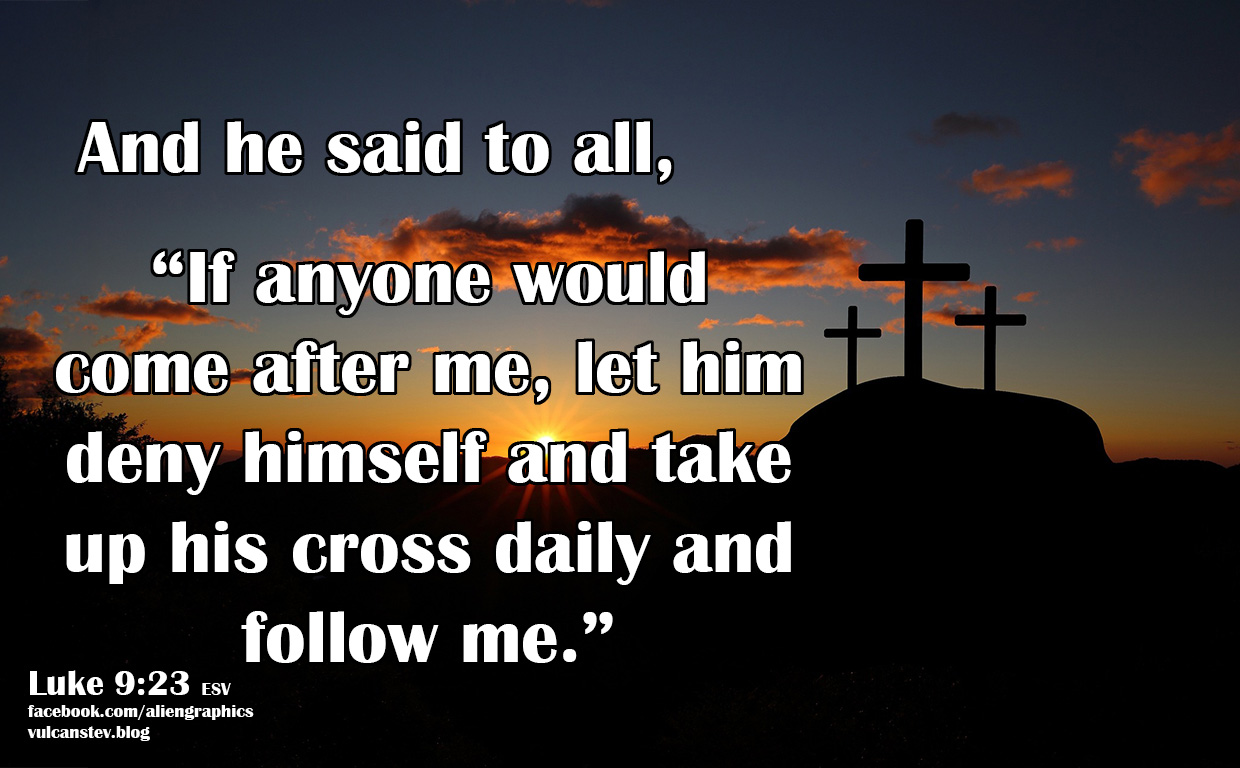 23 And he said to all, “If anyone would come after me, let him deny himself and take up his cross daily and follow me. 24 For whoever would save his life will lose it, but whoever loses his life for my sake will save it. 25 For what does it profit a man if he gains the whole world and loses or forfeits himself? 26 For whoever is ashamed of me and of my words, of him will the Son of Man be ashamed when he comes in his glory and the glory of the Father and of the holy angels. 27 But I tell you truly, there are some standing here who will not taste death until they see the kingdom of God.”