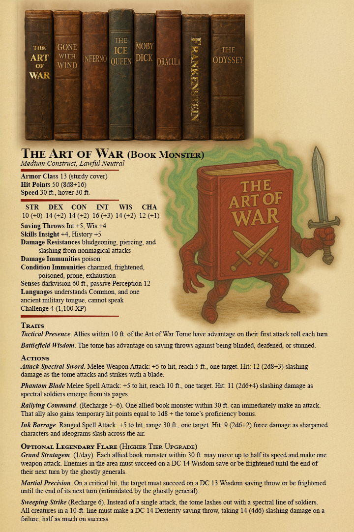 - Rallying Command (Recharge 5–6). One allied book monster within 30 ft. can immediately make an attack. That ally also gains temporary hit points equal to 1d8 + the tome’s proficiency bonus.