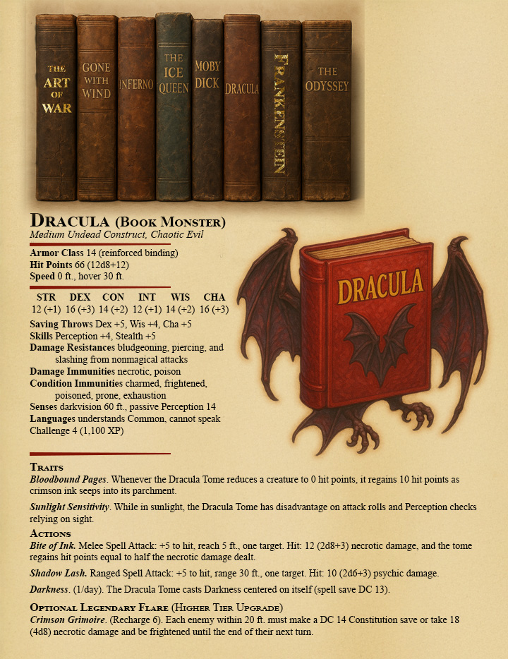 - Trigger: The fight begins when one book is pulled from the shelf. The rest join after 1 round, 1d4 books at a time, for rising tension.