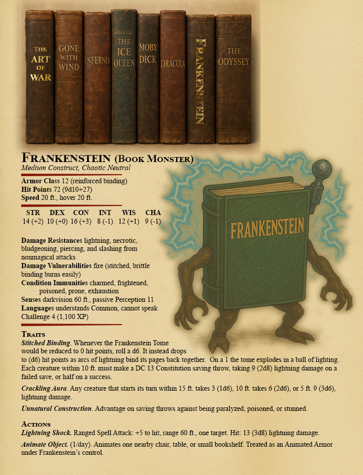 - Stitched Binding. Whenever the Frankenstein Tome would be reduced to 0 hit points, roll a d6. It instead drops to (d6) hit points as arcs of lightning bind its pages back together. On a 1 the tome explodes in a ball of lighting. Each creature within 10 ft. must make a DC 13 Constitution saving throw, taking 9 (2d8) lightning damage on a failed save, or half on a success.