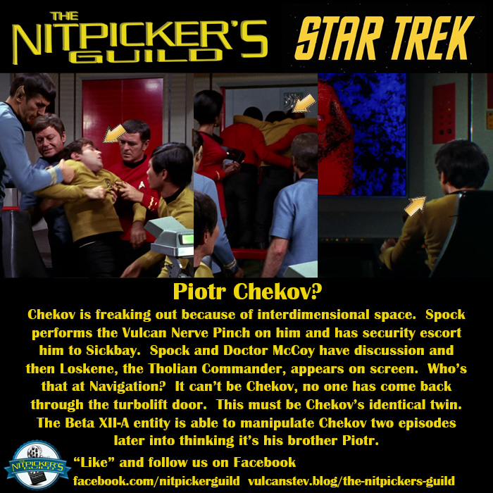 Obviously, it’s not Piotr. The entire bridge crew is aware that Pavel has no brother. Chekov’s replacement is his look-a-like double, Davýd Dzhónsov. I’m sure the two get teased about being “brothers” all the time. The Beta XII-A entity is to use the memories of this double to make Chekov “THINK” he has a brother named Piotr.