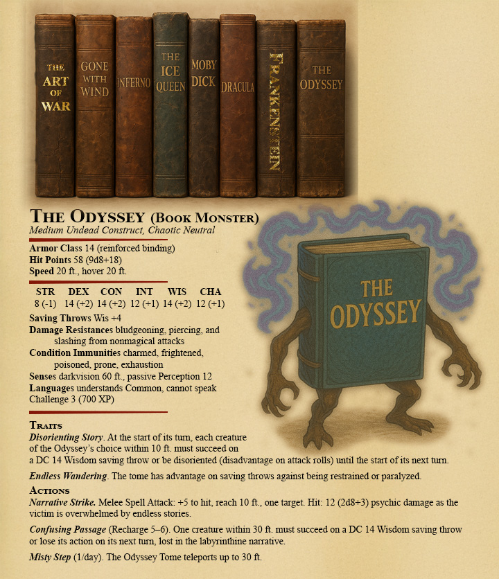 - Trigger: The fight begins when one book is pulled from the shelf. The rest join after 1 round, 1d4 books at a time, for rising tension.