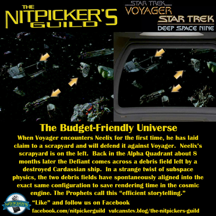 We can assume that Neelix’s scrapyard contains mostly debris from Delta Quadrant ships as the Caretaker hasn’t (as far as we know) been pulling Alpha Quadrant ships to the Delta Quadrant left and right. Yet through some quirk of subspace physics, eight months after Neelix has laid claim to his scrapyard, the debris from a single, destroyed, Cardassian ship in the Alpha Quadrant aligns itself identically with Neelix’s scrapyard. Right down to size, shape, and placement of the identical pieces.
