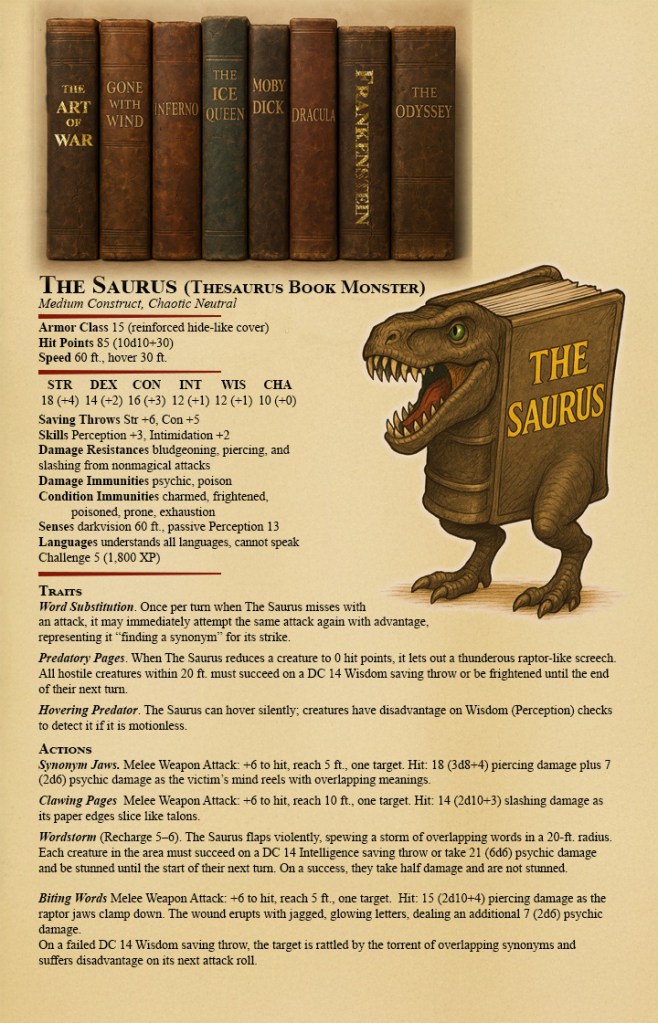 - Word Substitution. Once per turn when The Saurus misses with an attack, it may immediately attempt the same attack again with advantage, representing it “finding a synonym” for its strike.