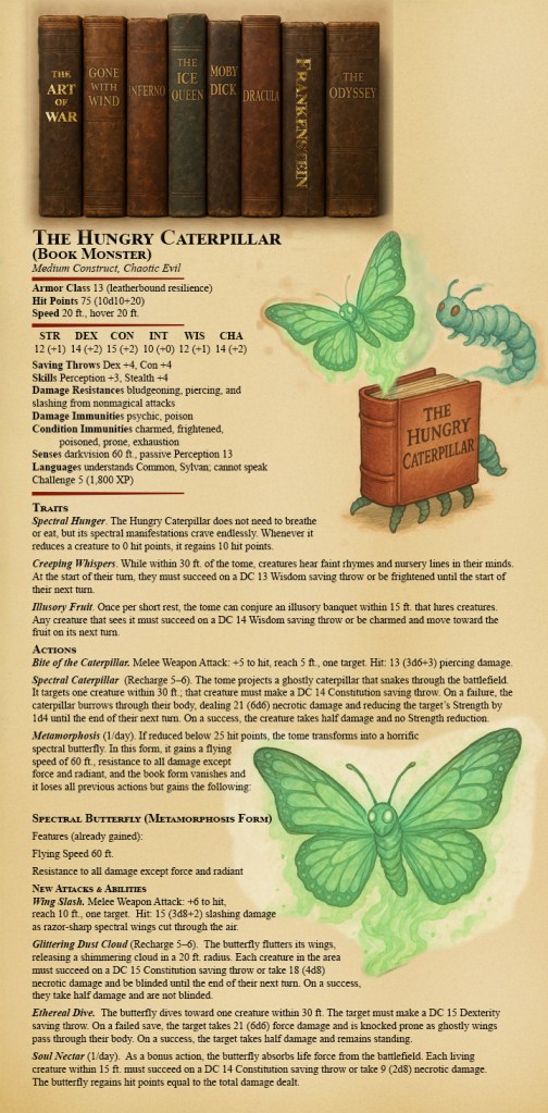 - Spectral Caterpillar (Recharge 5–6). The tome projects a ghostly caterpillar that snakes through the battlefield. It targets one creature within 30 ft.; that creature must make a DC 14 Constitution saving throw. On a failure, the caterpillar burrows through their body, dealing 21 (6d6) necrotic damage and reducing the target’s Strength by 1d4 until the end of their next turn. On a success, the creature takes half damage and no Strength reduction.
