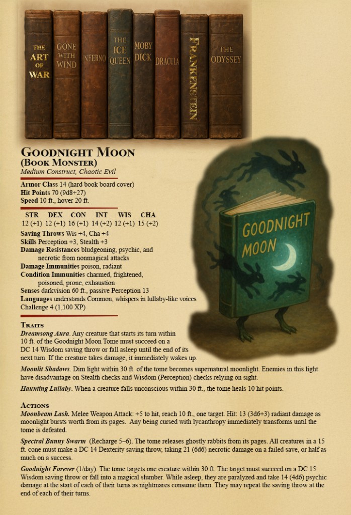 - Trigger: The fight begins when one book is pulled from the shelf. The rest join after 1 round, 1d4 books at a time, for rising tension.