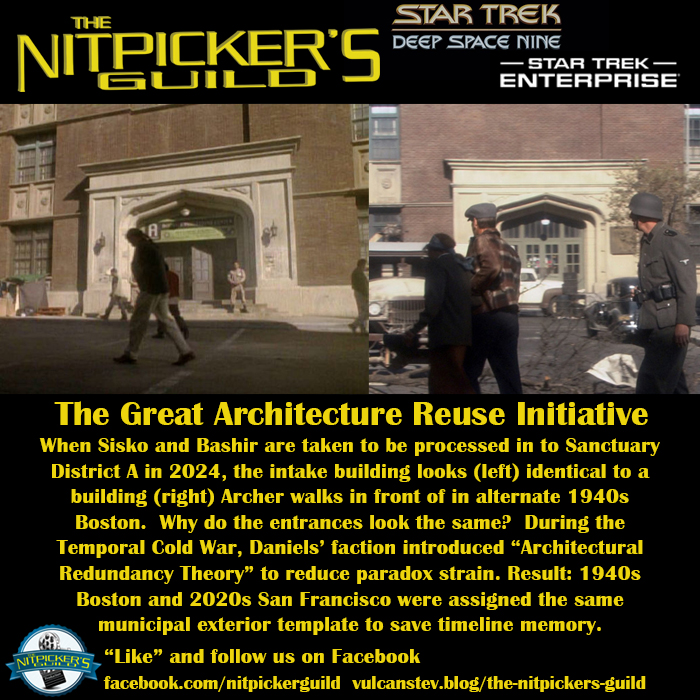 For example, today’s nit looks at what is obviously a redress of the entrance to Building I on Paramount’s backlot. Since we KNOW that Star Trek is not just a TV, we need a good in-universe reason why 2020s San Francisco looks remarkably like 1940s Boston. Q gets blamed enough. I like the “Architectural Redundancy” of the Temporal Cold War.