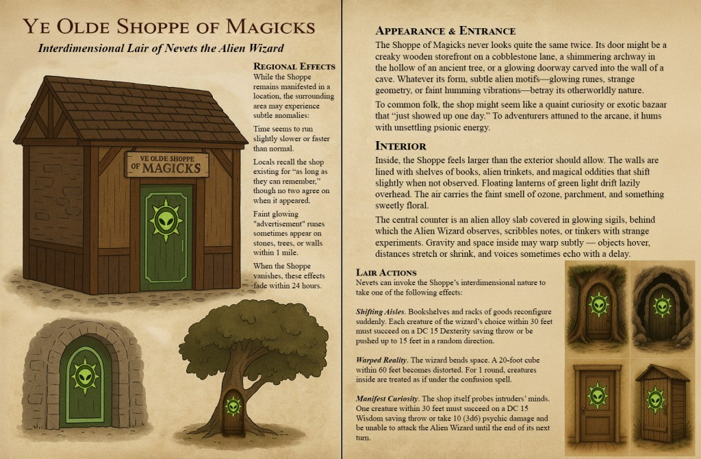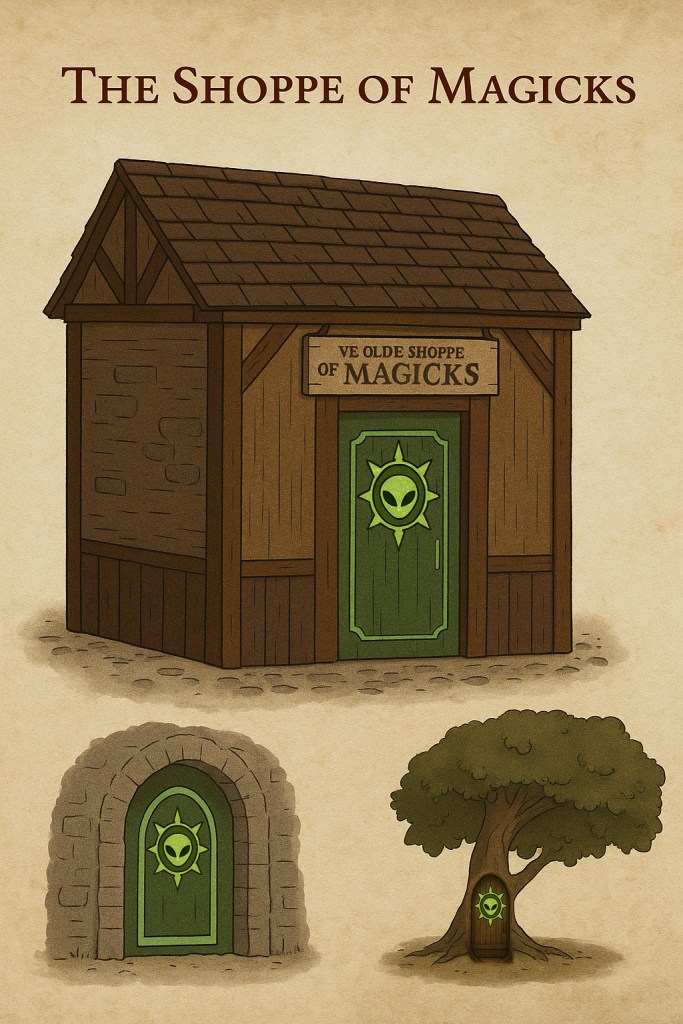 The Shoppe of Magicks never looks quite the same twice. Its door might be a creaky wooden storefront on a cobblestone lane, a shimmering archway in the hollow of an ancient tree, or a glowing doorway carved into the wall of a cave. Whatever its form, subtle alien motifs—glowing runes, strange geometry, or faint humming vibrations—betray its otherworldly nature.