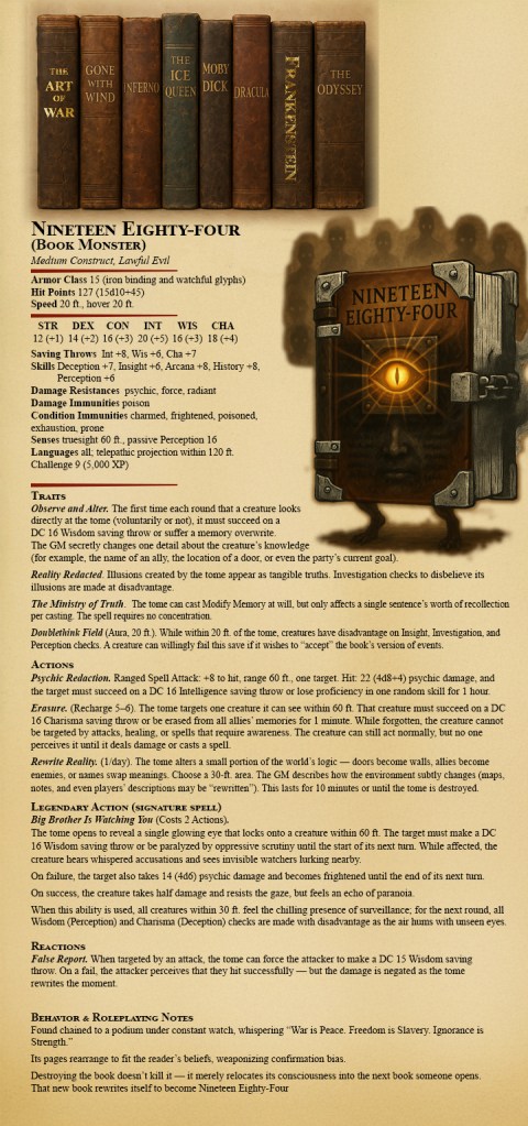 - Doublethink Field (Aura, 20 ft.). While within 20 ft. of the tome, creatures have disadvantage on Insight, Investigation, and Perception checks. A creature can willingly fail this save if it wishes to “accept” the book’s version of events.