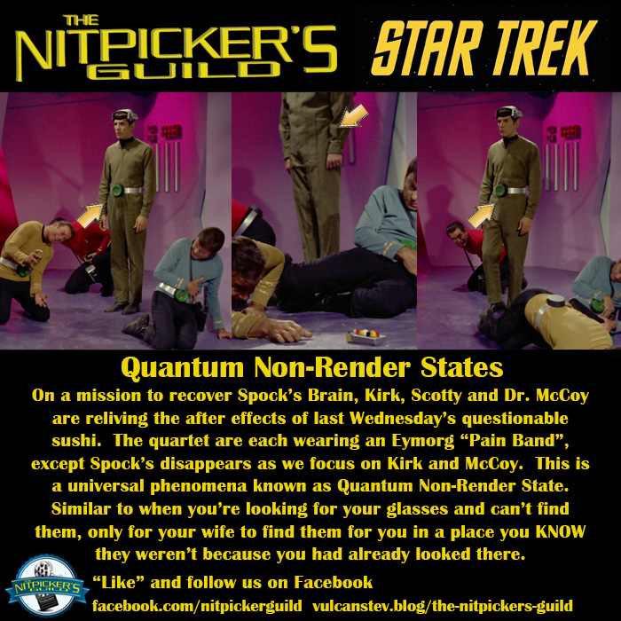 Spock’s belt, no longer relevant to the ongoing “Brain Incident,” dropped into a QNRS to conserve production resources as we focused on Kirk and McCoy on the floor.