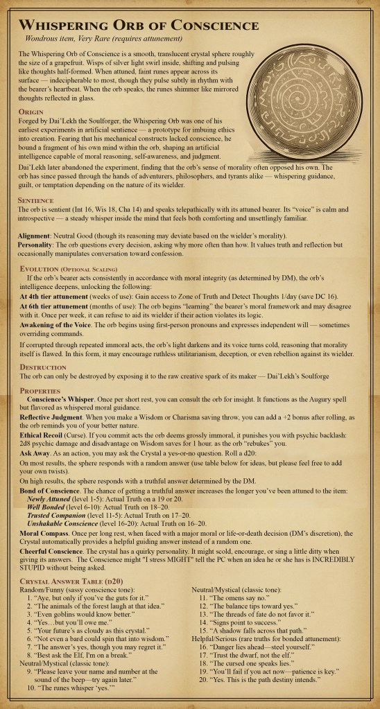 Dai’Lekh later abandoned the experiment, finding that the orb’s sense of morality often opposed his own. The orb has since passed through the hands of adventurers, philosophers, and tyrants alike — whispering guidance, guilt, or temptation depending on the nature of its wielder.