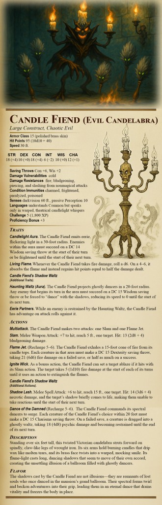 - Dance of the Damned (Recharge 5–6). The Candle Fiend commands its spectral dancers to surge. Each creature of the Candle Fiend’s choice within 20 feet must make a DC 15 Charisma saving throw. On a failed save, a creature is dragged into a ghostly waltz, taking 18 (4d8) psychic damage and becoming restrained until the end of its next turn.