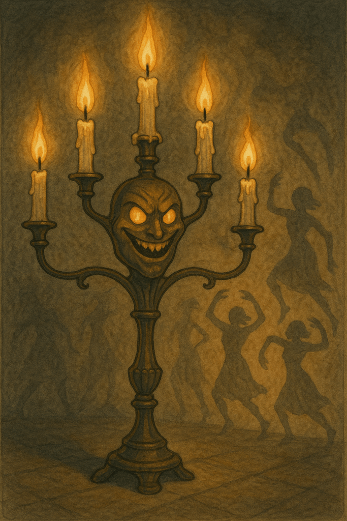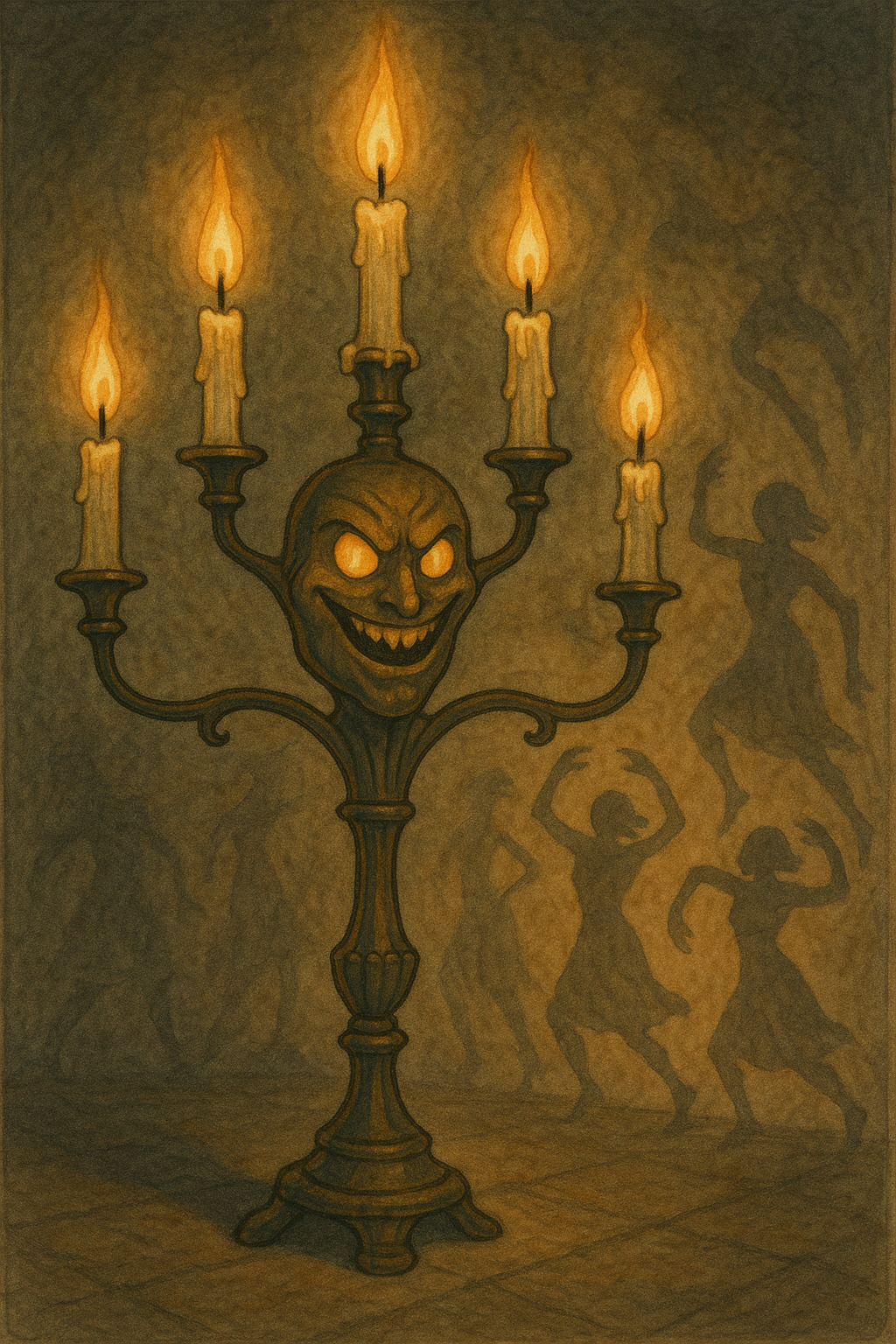 Standing over six feet tall, this twisted Victorian candelabra struts forward on spindly, claw-like legs of wrought iron. Its six arms hold burning candles that drip wax like molten tears, and its brass face twists into a warped, mocking smile. Its flame-light casts long, dancing shadows that seem to move of their own accord, creating the unsettling illusion of a ballroom filled with ghostly dancers.