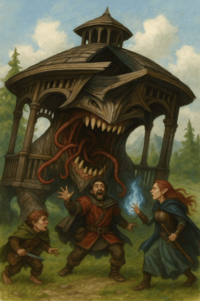The Monster Gazebo is a patient predator born from druidic experiments gone wrong — or perhaps from the sheer psychic energy of every adventurer who ever attacked one. It resembles an ordinary gazebo in every way: decorative railing, ornate roof, even inviting benches inside. But its slats breathe. Its pillars flex. Its lattice hums faintly in the dark.