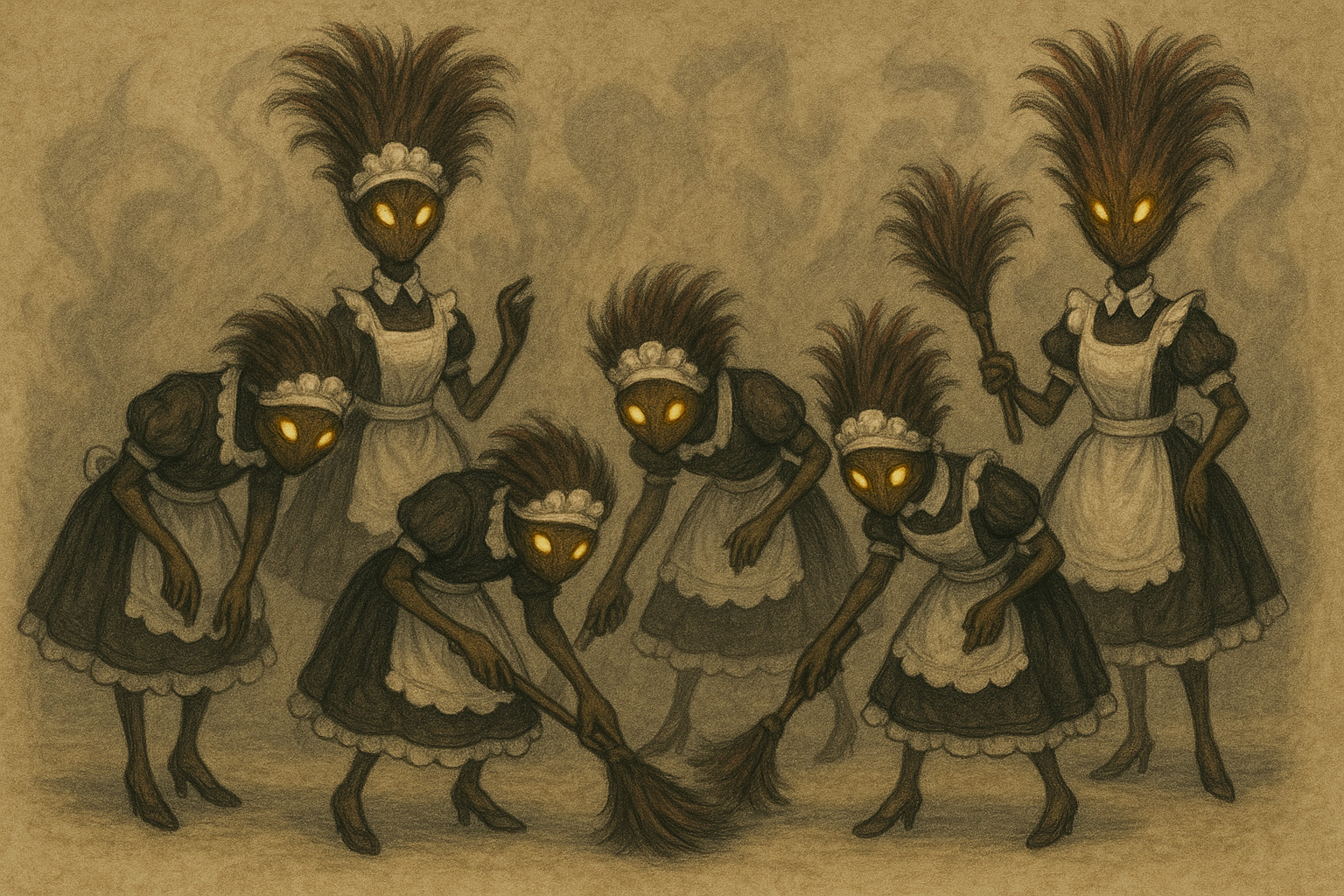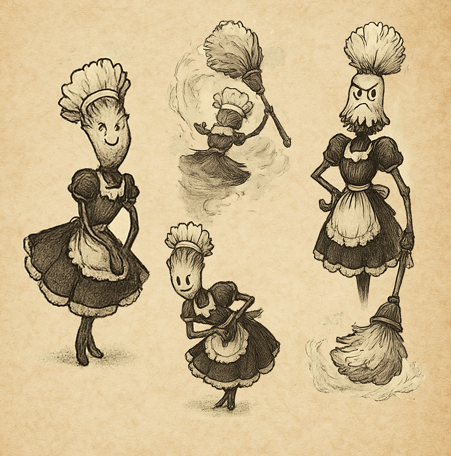 Animated in frilly French maid uniforms (faded and tattered, stitched into their feathered shafts), these dusters scuttle across the mansion’s halls, clacking on their broomstick handles like stilt legs. They titter with squeaky laughter as they beat adventurers about the head with a storm of dust, choking them and clouding the battlefield.