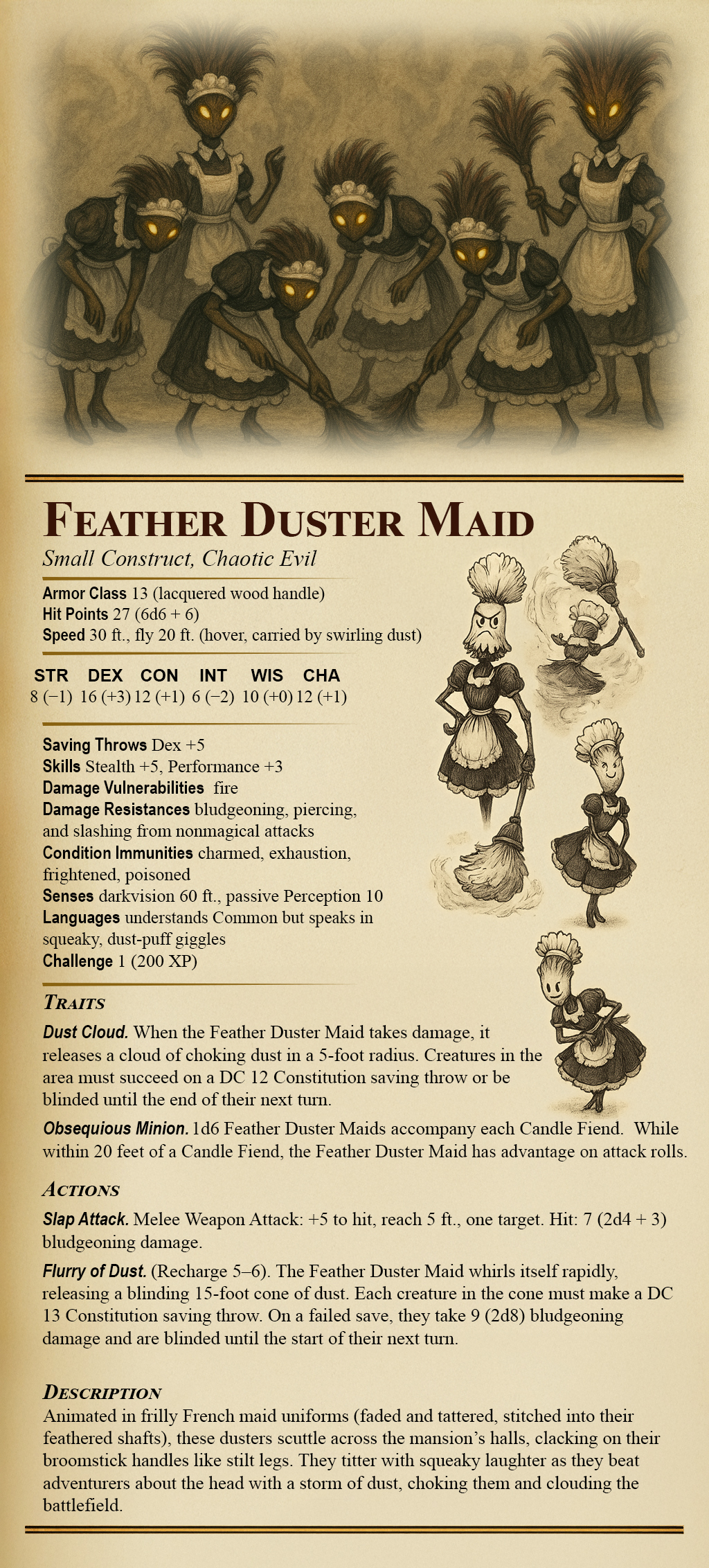 - Flurry of Dust (Recharge 5–6). The Feather Duster Maid whirls itself rapidly, releasing a blinding 15-foot cone of dust. Each creature in the cone must make a DC 13 Constitution saving throw. On a failed save, they take 9 (2d8) bludgeoning damage and are blinded until the start of their next turn.