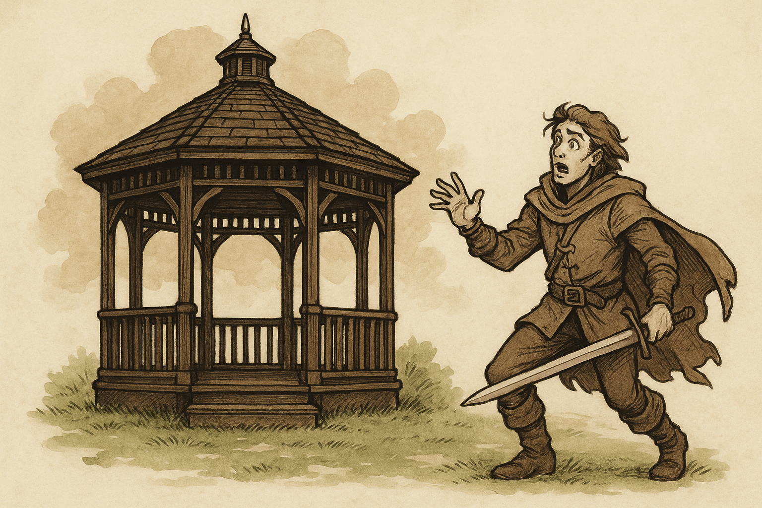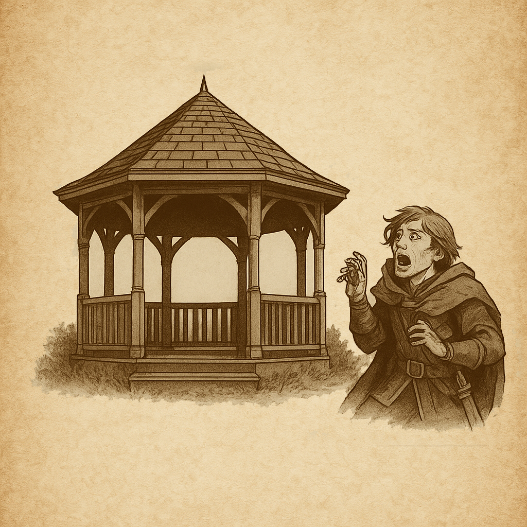 A gazebo is a charming open structure often found in gardens, courtyards, and parks. Built of wood or wrought iron, it provides shade, shelter, and — in certain rare circumstances — mortal terror to adventurers who have never heard the word before.