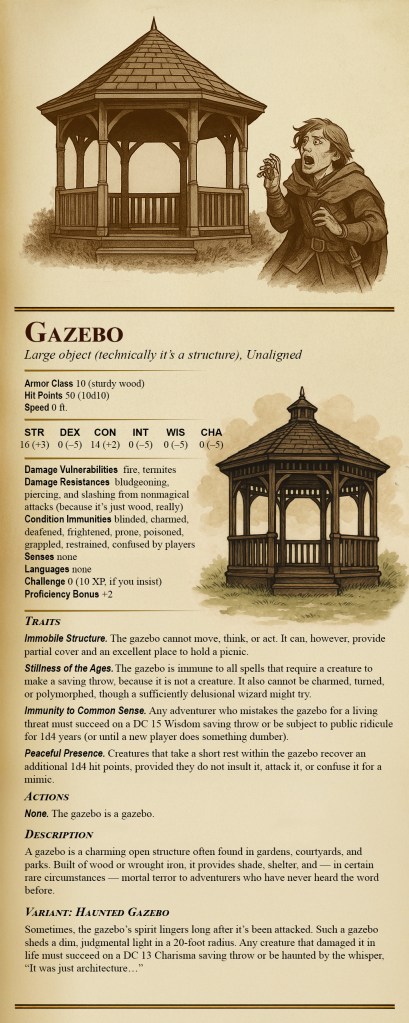 - Immunity to Common Sense. Any adventurer who mistakes the gazebo for a living threat must succeed on a DC 15 Wisdom saving throw or be subject to public ridicule for 1d4 years (or until a new player does something dumber).