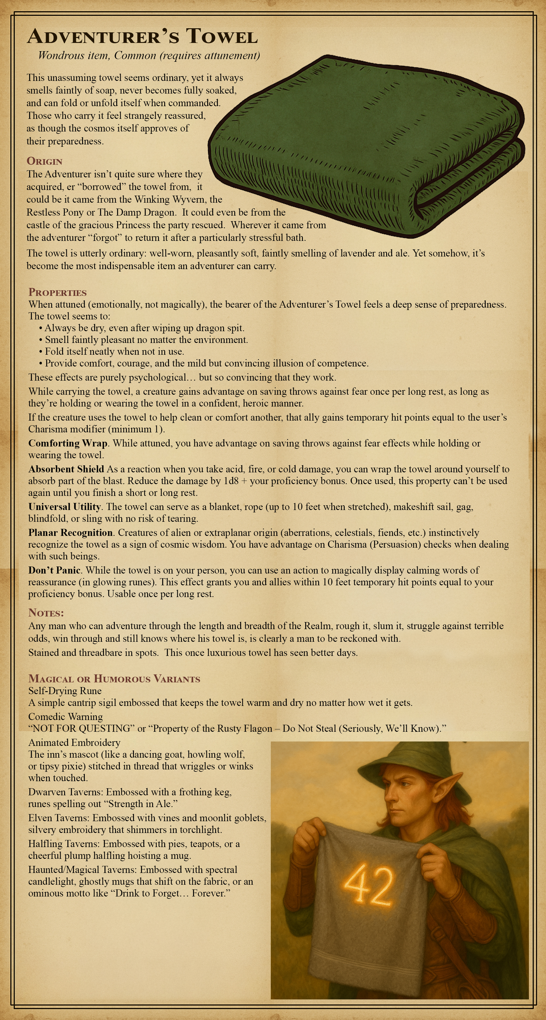 When attuned (emotionally, not magically), the bearer of the Adventurer’s Towel feels a deep sense of preparedness. The towel seems to:
