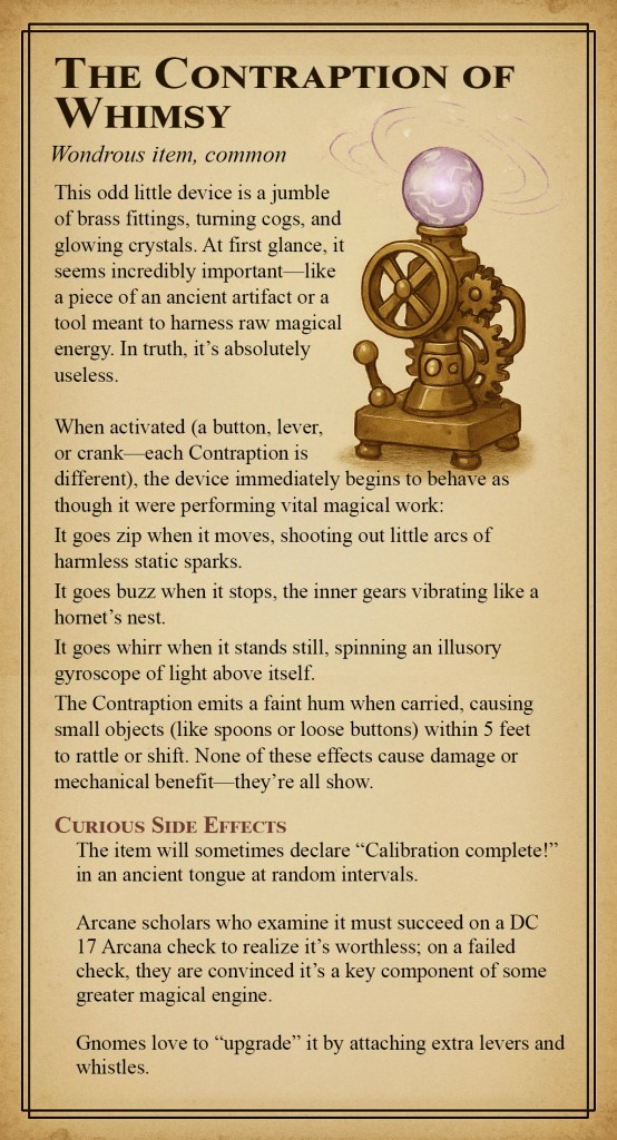 The Contraption emits a faint hum when carried, causing small objects (like spoons or loose buttons) within 5 feet to rattle or shift. None of these effects cause damage or mechanical benefit—they’re all show.