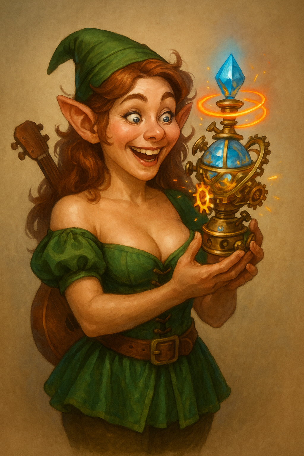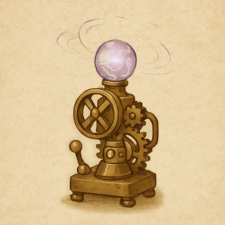 This odd little device is a jumble of brass fittings, turning cogs, and glowing crystals. At first glance, it seems incredibly important—like a piece of an ancient artifact or a tool meant to harness raw magical energy. In truth, it’s absolutely useless.