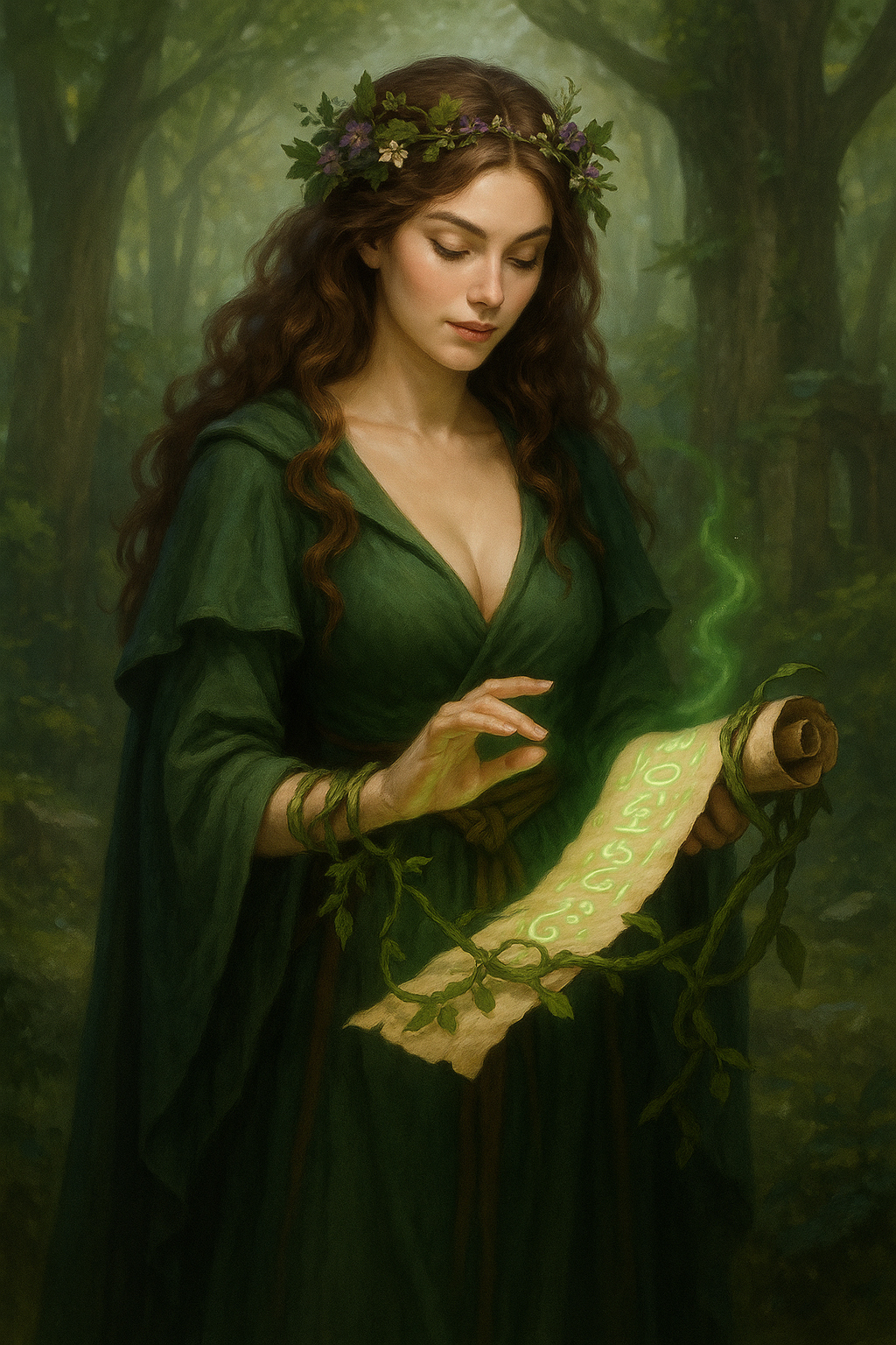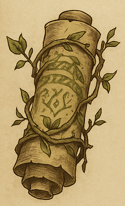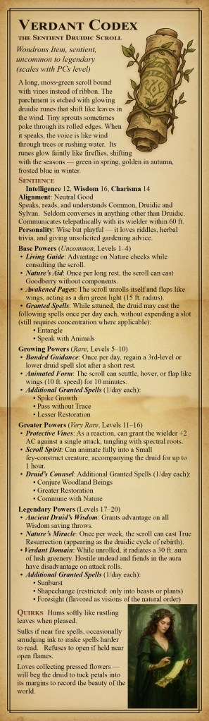 A long, moss-green scroll bound with vines instead of ribbon. The parchment is etched with glowing druidic runes that shift like leaves in the wind. Tiny sprouts sometimes poke through its rolled edges. When it speaks, the voice is like wind through trees or rushing water. Its runes glow faintly like fireflies, shifting with the seasons — green in spring, golden in autumn, frosted blue in winter.