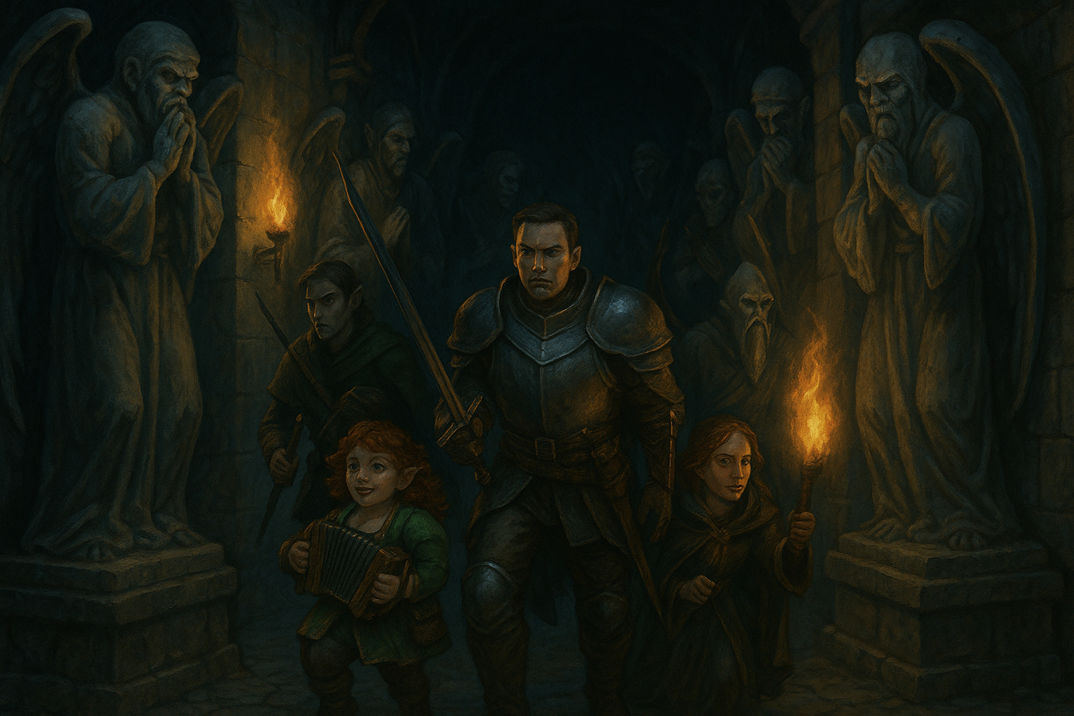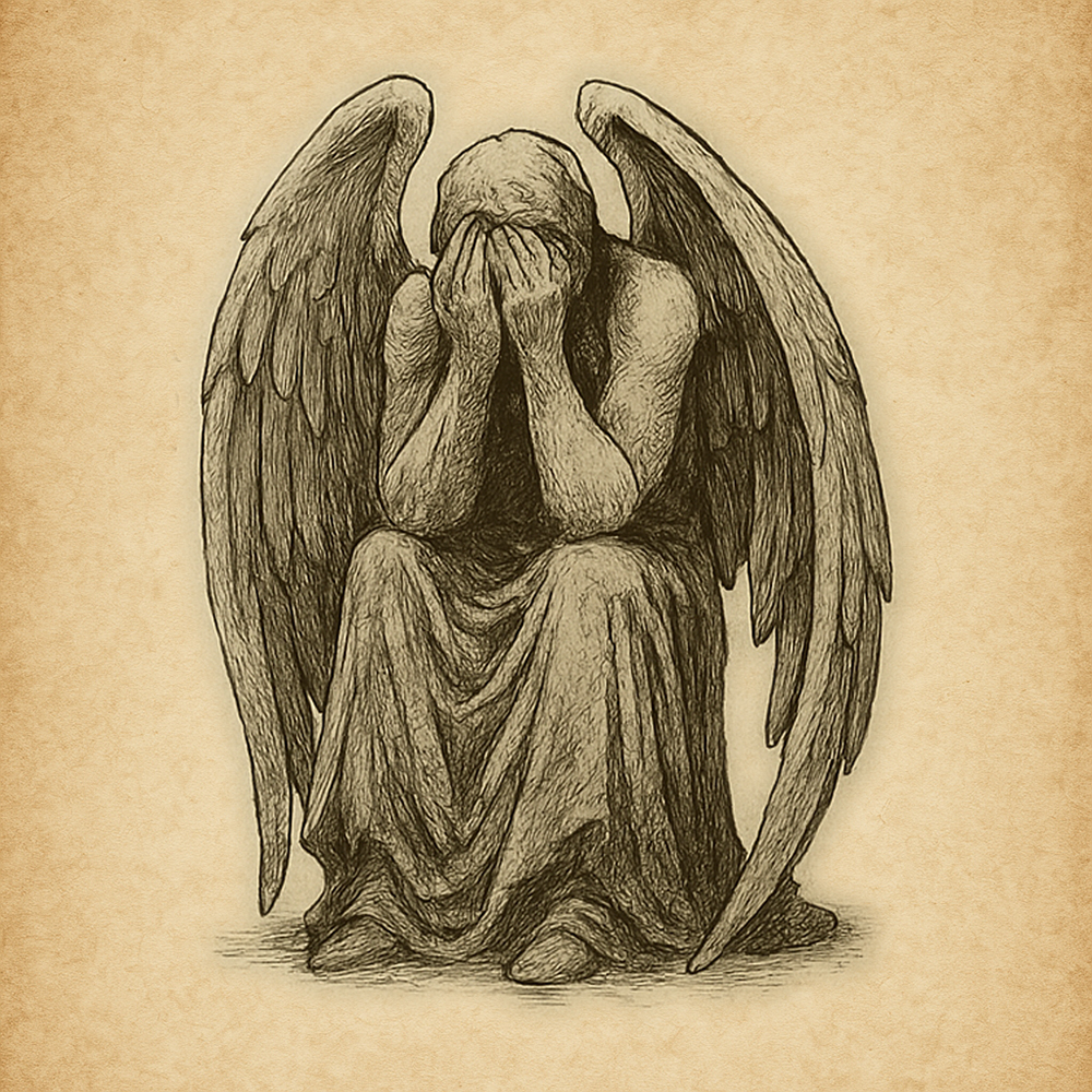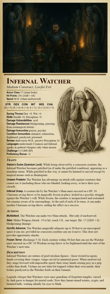 Infernal Watchers are statues of grief-stricken figures—faces twisted in agony, hands covering their visages, wings carved in unnatural poses. When unobserved, they surge forward with impossible speed, their stony hands seizing prey in a grip colder than death. Victims are not slain but trapped within their own minds, their bodies paralyzed as the Watcher feeds on their torment.