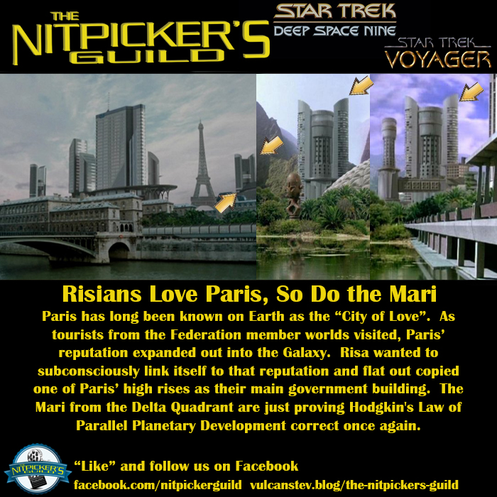 That’s a very unique piece of architecture seen in the 24th Century Paris skyline. The Risians were really taken by it and copied it down to the last self-sealing stembolt for their main government building. Because it’s never anything mundane like a re-used matte plate.
