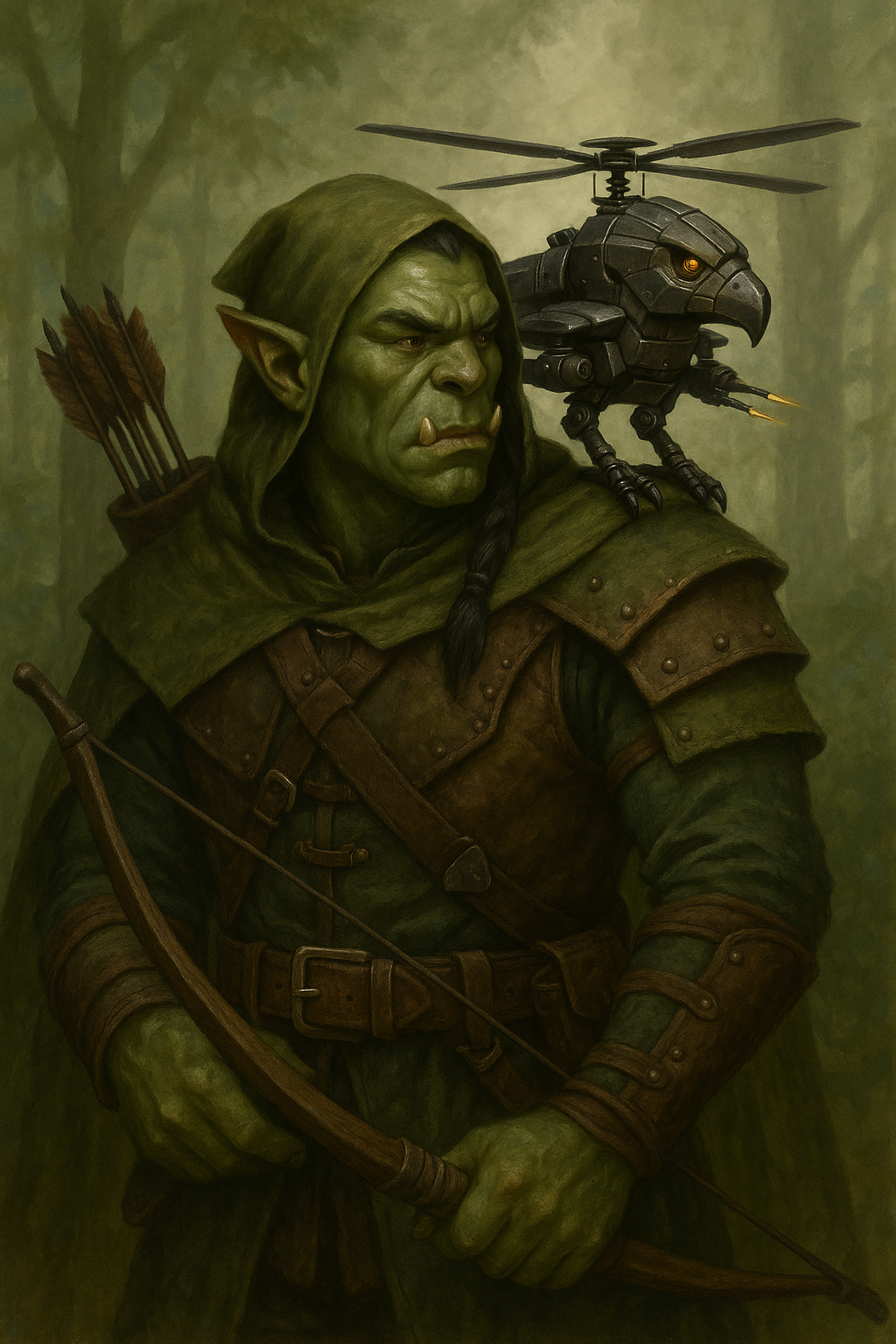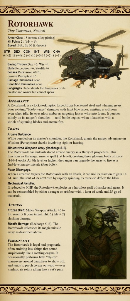 A Rotorhawk is a clockwork raptor forged from blackened steel and whirring gears. Four rotating “blade-wings” shimmer with faint blue runes, emitting a soft hum even when idle. Its eyes glow amber as targeting lenses whir into focus. It perches calmly on its ranger’s shoulder — until battle begins, when it launches with a shriek of spinning blades and arcane fire.